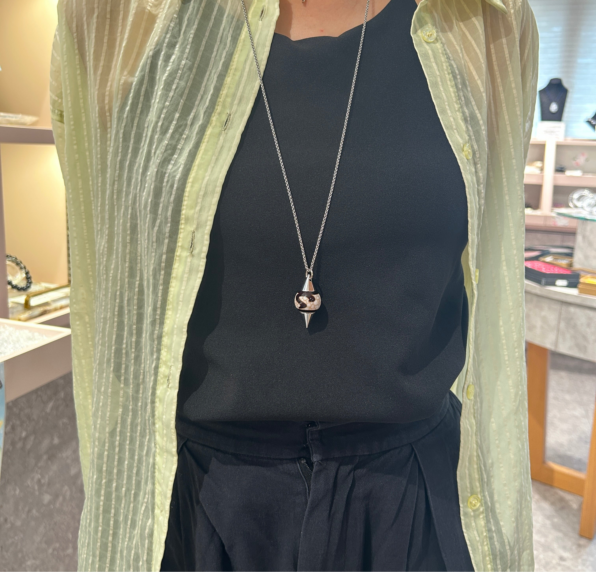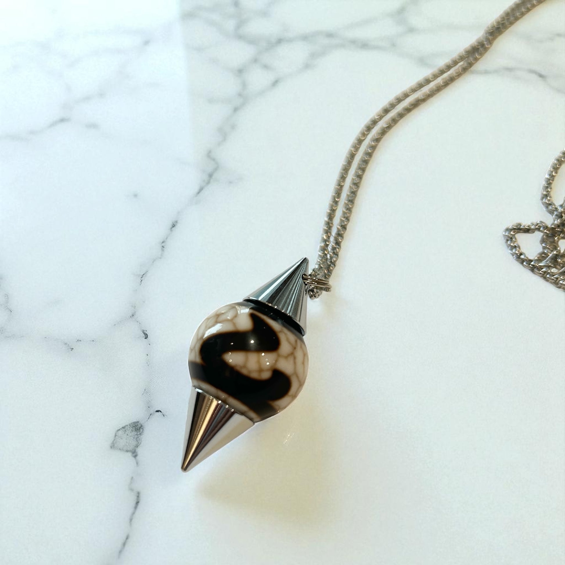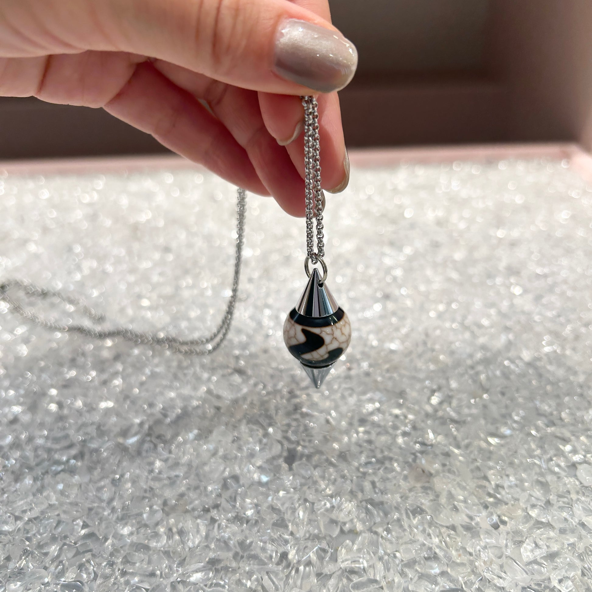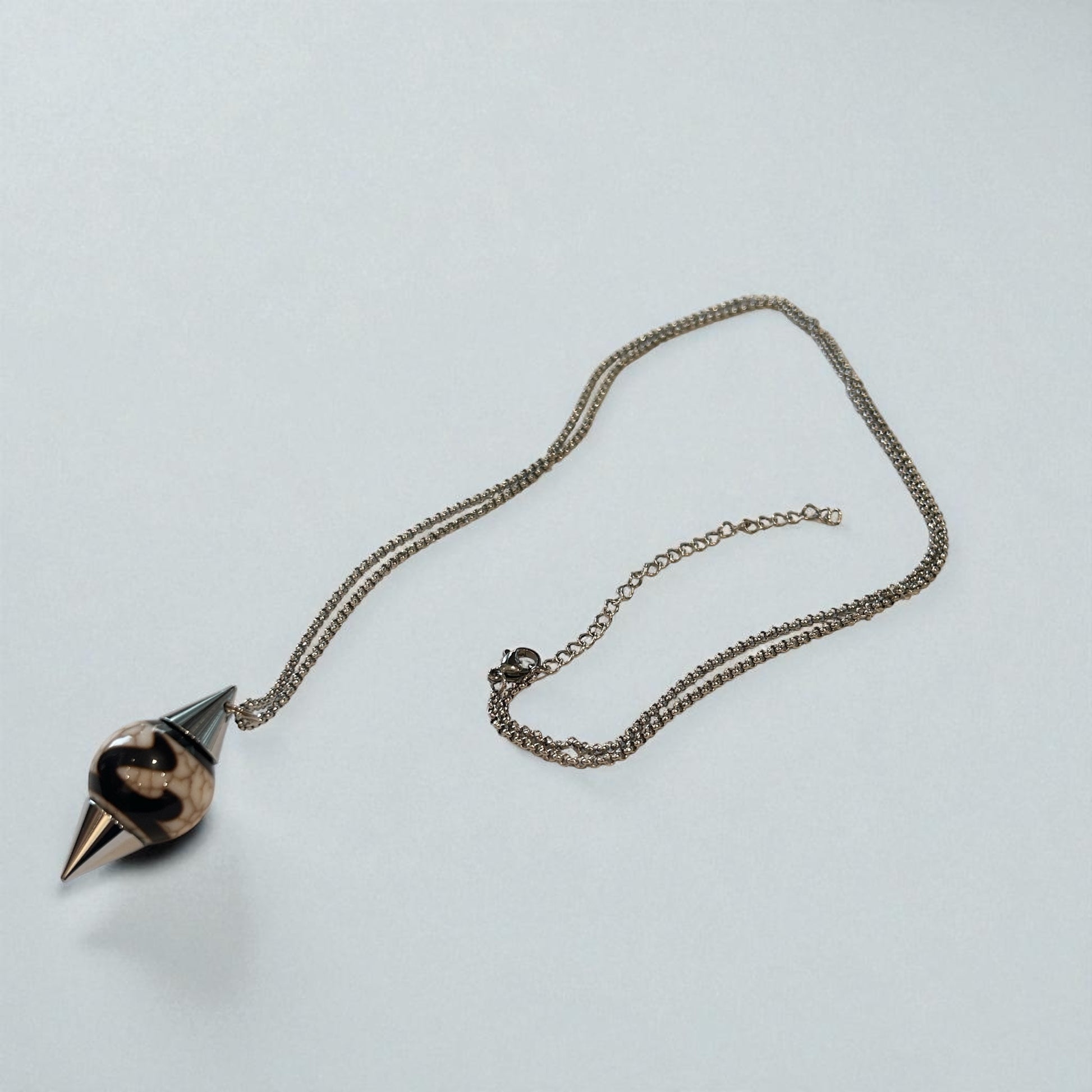 ダウジングに使う「振り子」のことで、自分の中の潜在意識の声を聞くためのアイテムです。本来人間が生きていくために水脈や鉱石を探す時の他に、自分自身の深い部分での本当の声を聞いて、判断するために使われています。選択肢に迷った時、ダウジングによって自分の内なる声や、本来自分が求めている答えを目に見える形で導き出すお手伝いをしてくれるといわれております。