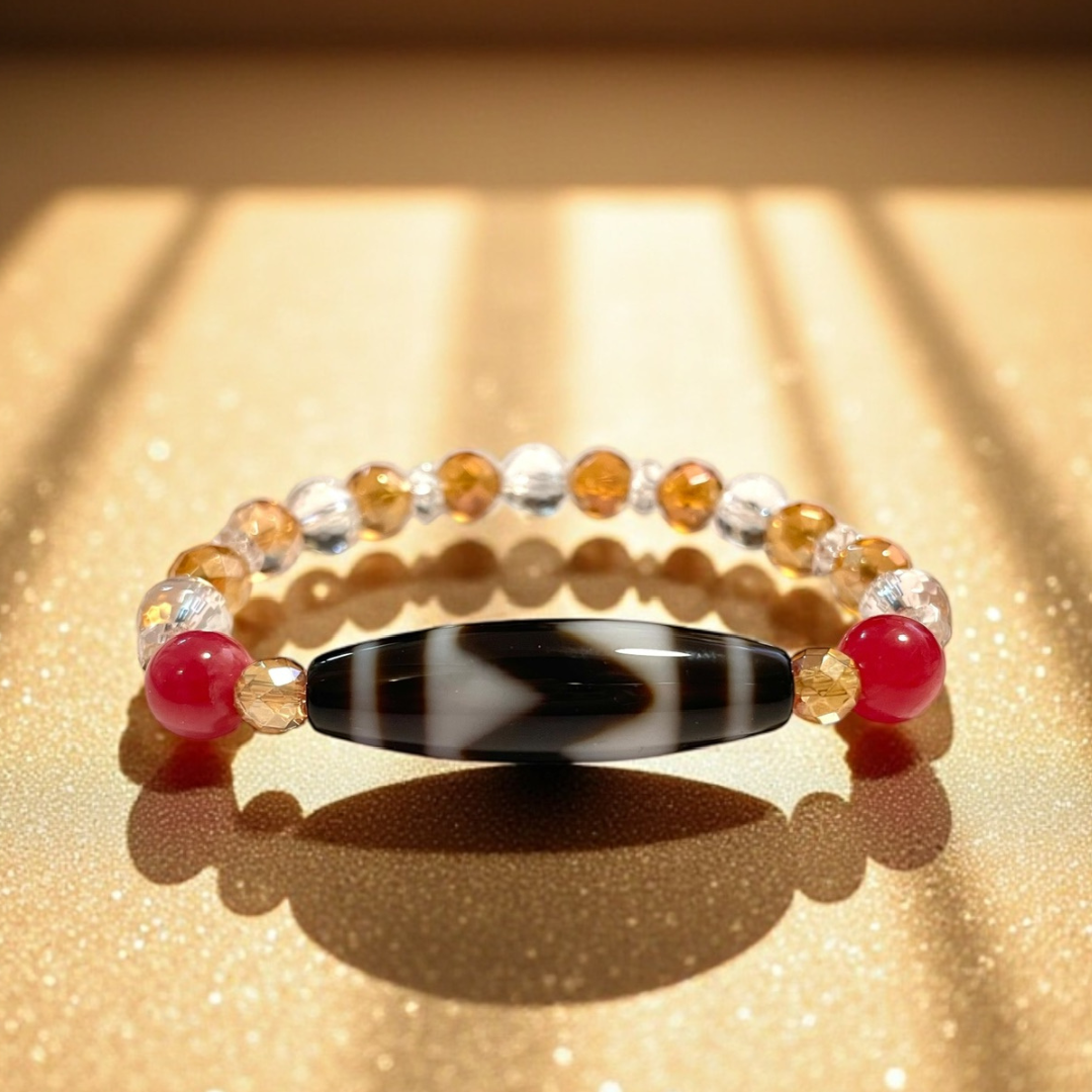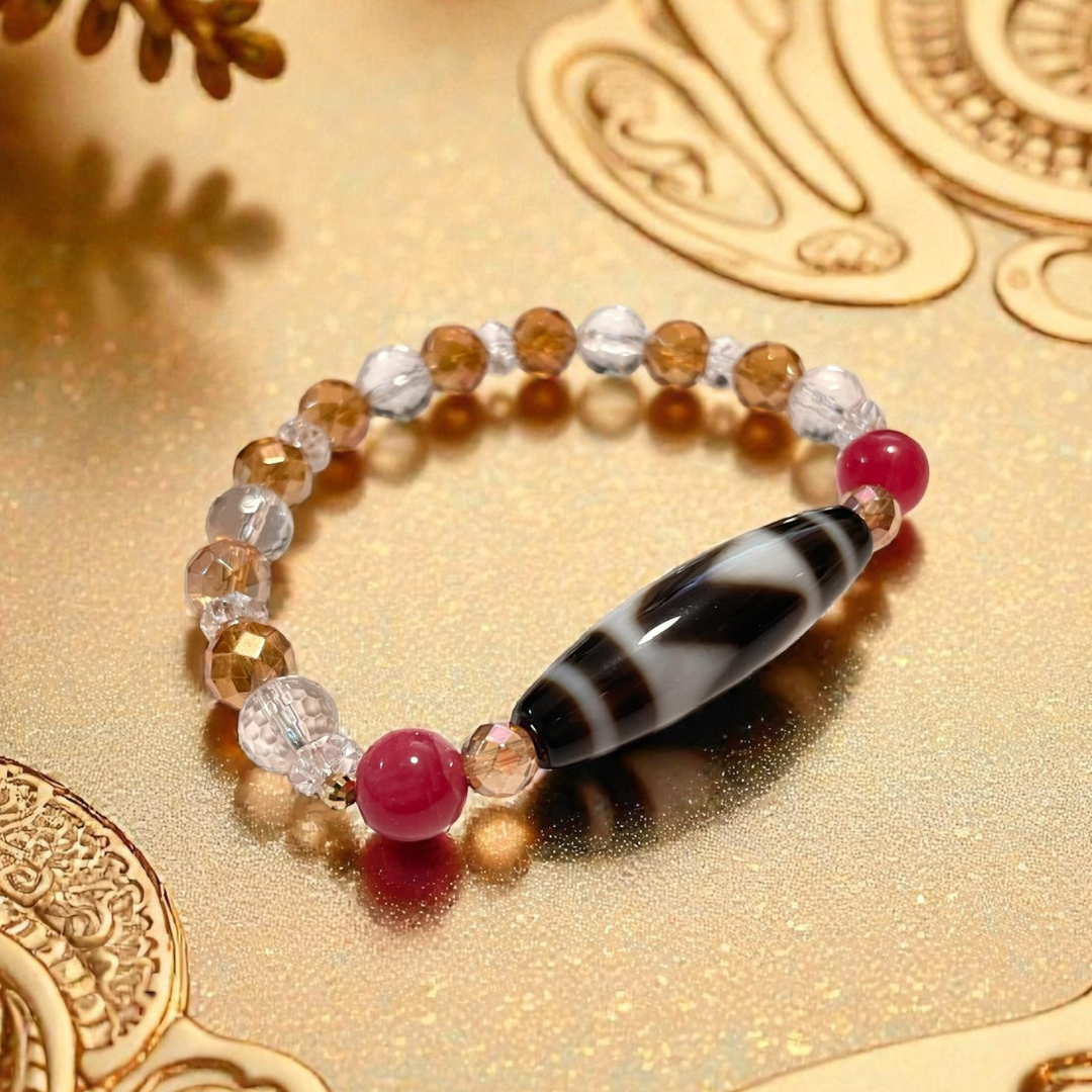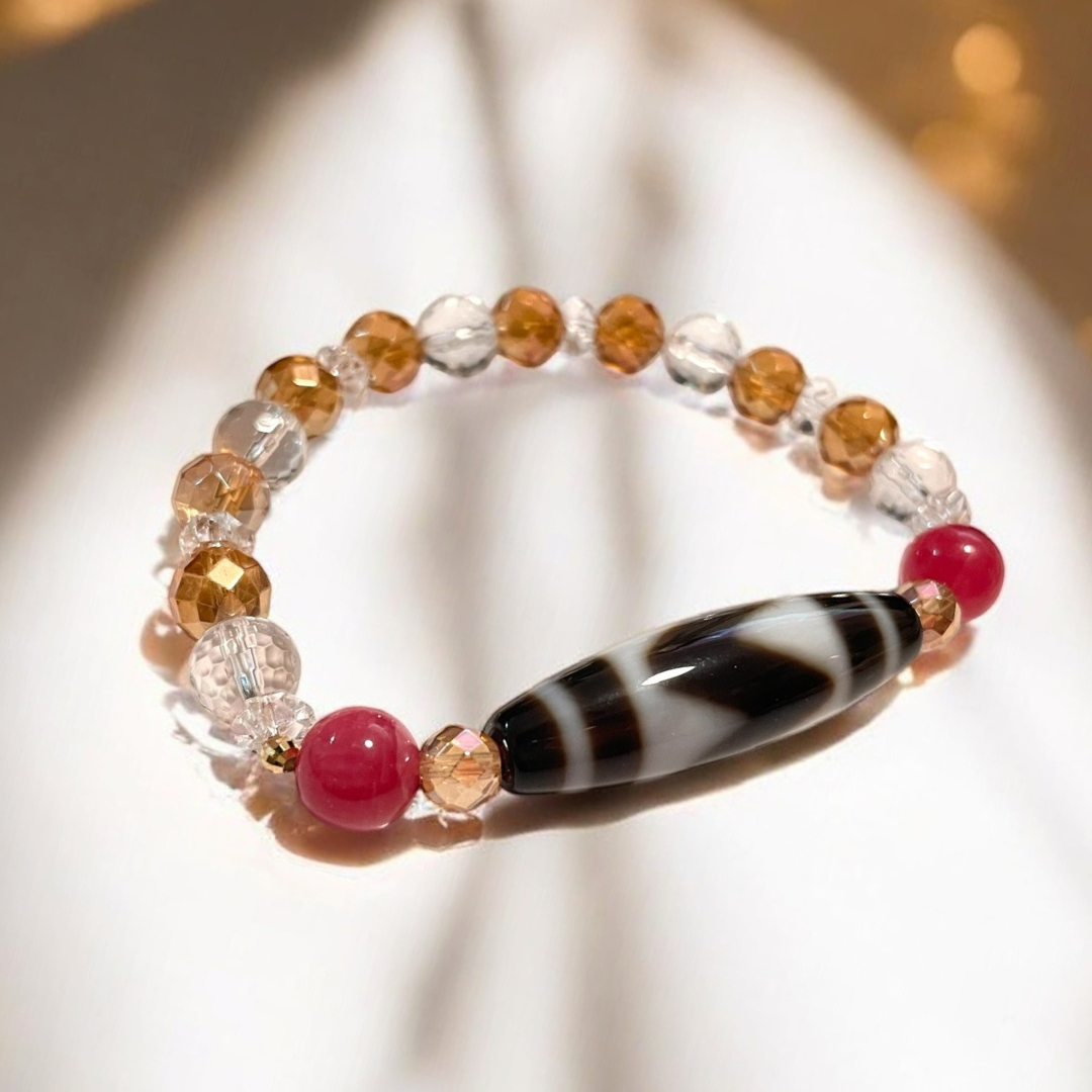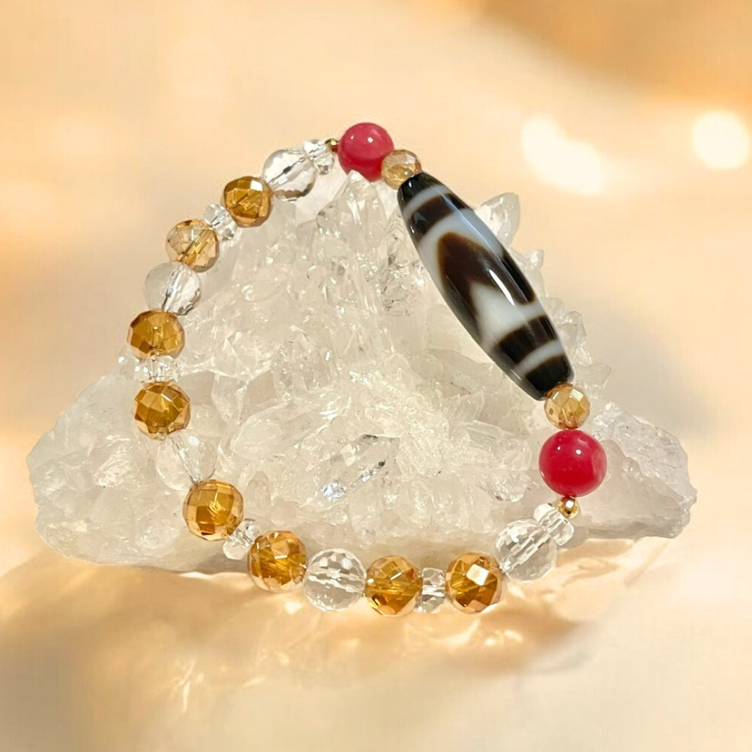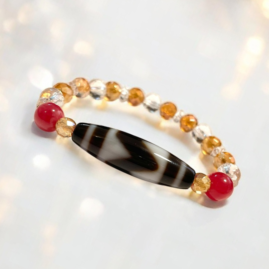 《一点物》K18入り虎牙天珠&水晶&オレンジオーラクウォーツ&ロードナイトブレスレット